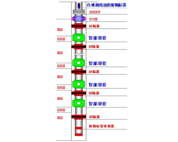 HITTOP智能滑套利用無線射頻通信技術(RFID),以射頻標簽為信號載體,通過地面控制系統(tǒng)寫入目標層段的開關控制指令。射頻標簽自井口投入,其經(jīng)過井下各層段智能滑套時,滑套內(nèi)的無線模塊接收標簽攜帶的控制指令,并執(zhí)行開啟或關閉動作。