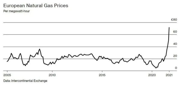 截止到上個(gè)月,歐洲的天然氣價(jià)格已經(jīng)飆升至一年前的4.6倍。