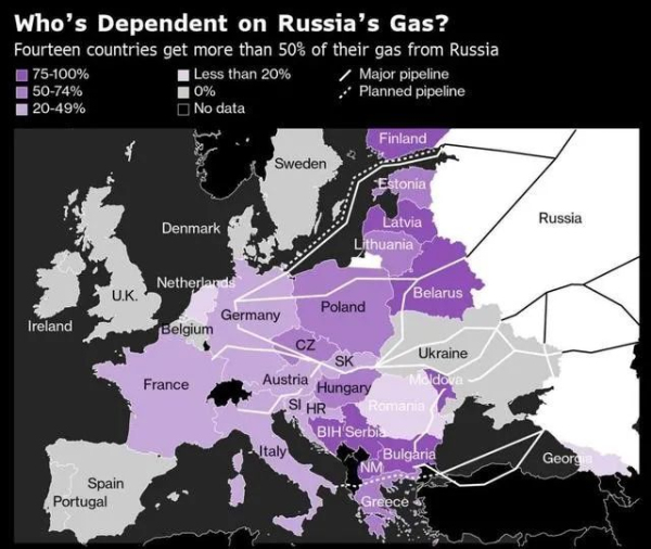 (示意圖:歐洲各國(guó)對(duì)俄羅斯天然氣的依賴,顏色越深,依賴度越高)